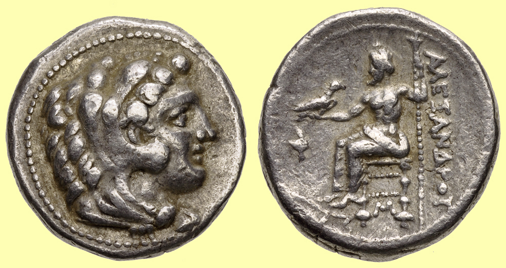 Mint: Babylon. Struck: Under Stamenes or Archon, circa 324/3 BC. Obv: [no legend] Head of Herakles right, wearing lion's skin headdress. Rev: ΑΛΕΞΑΝΔΡΟΥ Zeus Aëtophoros seated left; M in left field, monogram below throne. Ref: Price 3604; Seleucus I Hoard 1294 (this coin). Pedig: 2005 Commerce ("Selucus I") Hoard (CH X, 265). |