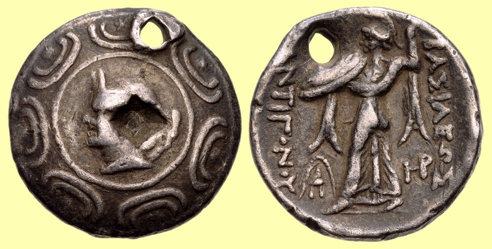 Mint: Amphipolis. Struck: Circa 274/1-260/55 BC. Obv: [no legend] Horned head of Pan left, with lagobolon over shoulder, in the center of a Macedonian shield. Rev: BAΣΙΛΕΩΣ ΑΝΤΓΟΝΟΥ Athena Alkidemos, seen from behind, advancing left, shield decorated with aegis on left arm, preparing to cast thunderbolt held aloft in right hand; crested Macedonian helmet to inner left, HP monogram to inner right. Ref: Panagopoulou Period I, 152 (O1/R1) = BM Inv. 1886, 1111.1; otherwise unpublished. Pedig: Ex Classical Numismatic Group Electronic Auction 336 (8 October 2014), lot 49. |
