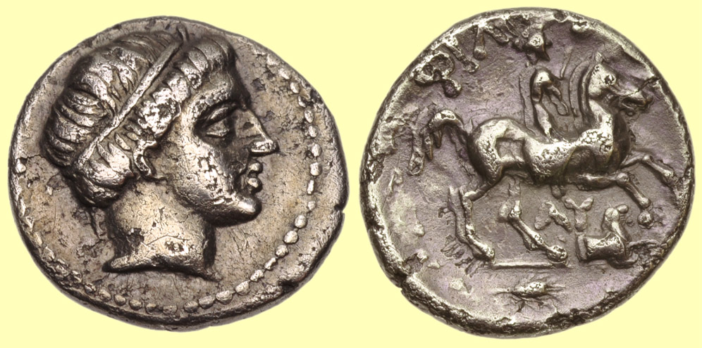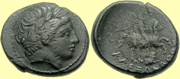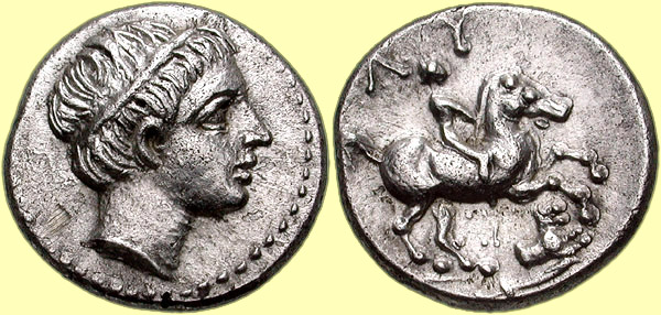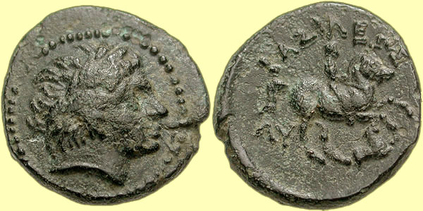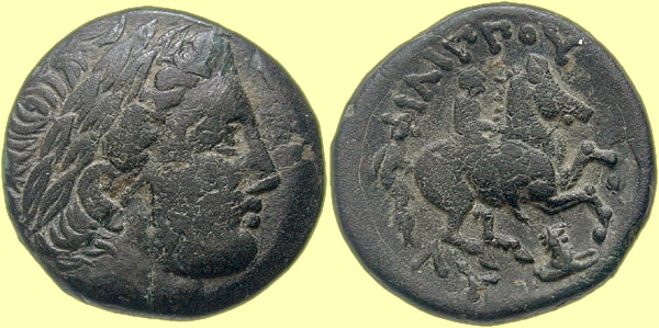 Mint: Amphipolis. Struck: 311-305 BC. Obv: [no legend] Diademed head of Apollo right. Rev: ΛY Rider on horseback right; below, forepart of lion right; in exergue, spearhead right. Ref: Thompson -; Müller p. 1, 1 (pl. 1, 1); cf. AMNG III/2, 5 (no spearhead?); SNG ANS -; Price 434. |