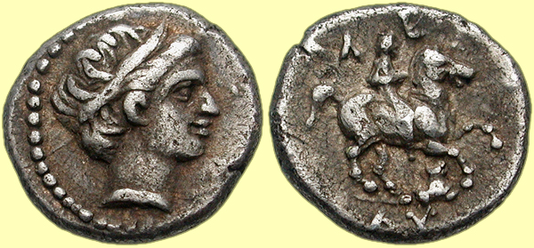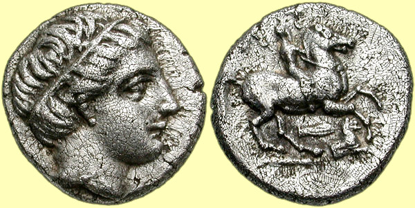 Mint: Amphipolis. Struck: 311-305 BC. Obv: [no legend] Diademed head of Apollo right. Rev: ΛY Rider on horseback right; below, spearhead right above forepart of lion right right. Ref: Thompson 3; Müller -; AMNG III/2, -; SNG ANS -; Price 434A. |