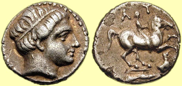 Mint: Amphipolis. Struck: Uncertain. Obv: [no legend] Laureate head of Apollo right. Rev: ΒΑΣΙΛΕΩΣ Horseman riding right; ΛY behind, forepart of lion right below. Ref: Thompson 4; Müller -; AMNG III/2, 5; SNG ANS -; Price 437A; Winterthur 1306e/1589 (same obverse die). |