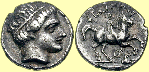 Mint: Amphipolis. Struck: Uncertain. Obv: [no legend] Laureate head of Apollo right. Rev: ΛY Horseman riding right; below, forepart of lion right. Ref: Thompson -; Müller p. 1, 2 (pl. I, 2); AMNG III/2, -; SNG ANS -; Price -. |